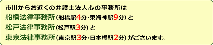 当法人は千葉県内に複数の事務所を構えており、市川からもお越しいただきやすいかと思いますので、弁護士との対面相談が必要になった際もお気軽にご利用ください。